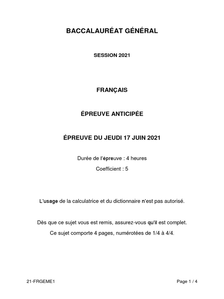 Les épreuves anticipées de français auront un coefficient de 10 (5 pour l'écrit et bac francais 2021. Le sujet et le corrigé de l'épreuve anticipée de français des centres étrangers.